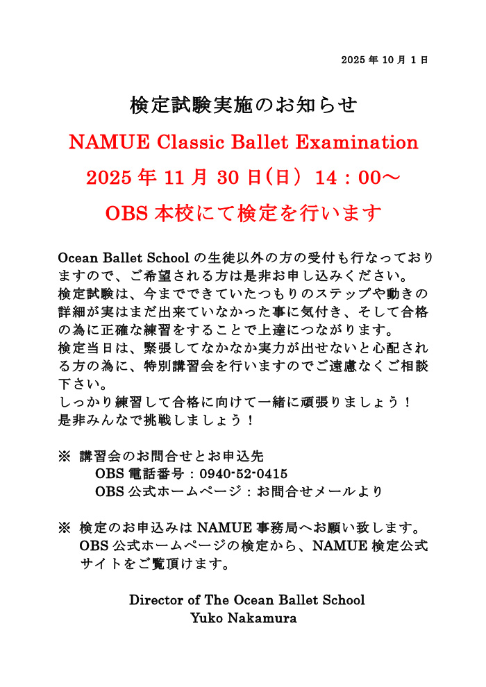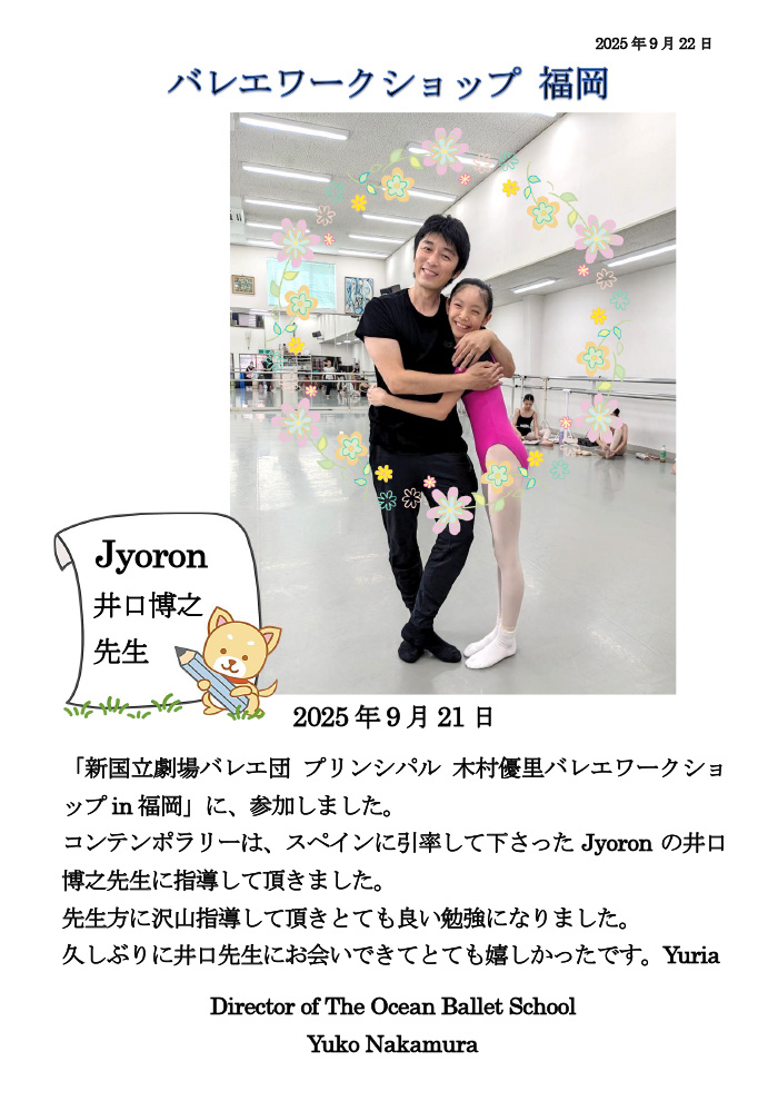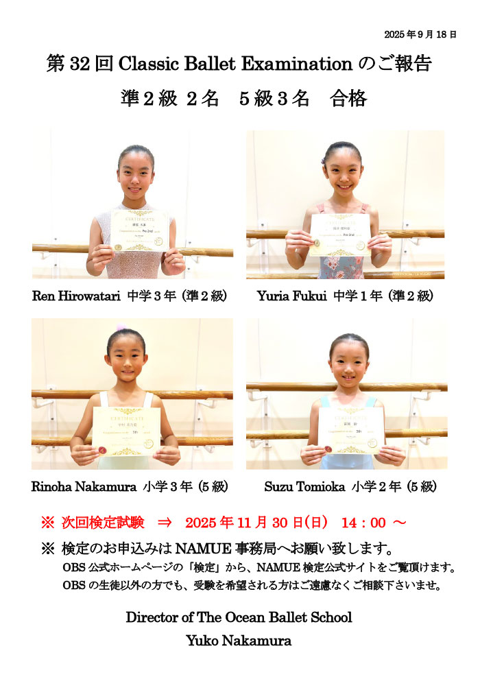 福岡県福津市の「オーシャンバレエスクール」は、イギリスやアメリカで6年間学び、NAMUEコンクール審査員、NAMUE検定認定講師も務める中村優子が主宰する、バランシンスタイルのバレエスクールです。